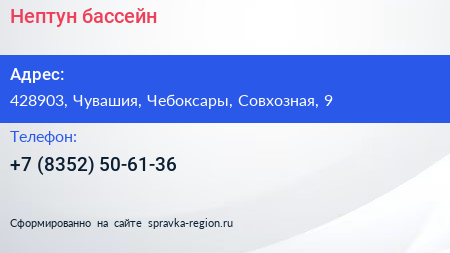 Нептун, бассейн по адресу 428903, Чувашия, Чебоксары, Совхозная, 9 в дальнейшем Организация, размещена в следующих категориях: