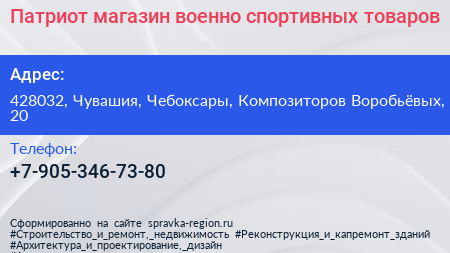 Патриот, магазин военно-спортивных товаров по адресу 428032, Чувашия, Чебоксары, Композиторов Воробьёвых, 20 в дальнейшем Организация, размещена в следующих категориях: