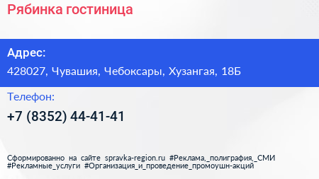 Рябинка, гостиница по адресу 428027, Чувашия, Чебоксары, Хузангая, 18Б в дальнейшем Организация, размещена в следующих категориях: