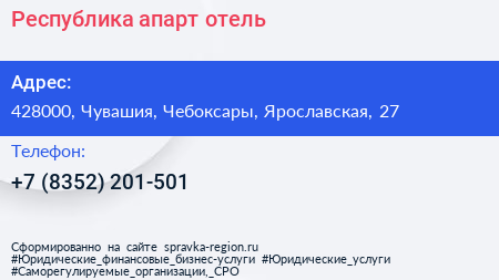 Республика, апарт-отель по адресу 428000, Чувашия, Чебоксары, Ярославская, 27 в дальнейшем Организация, размещена в следующих категориях: