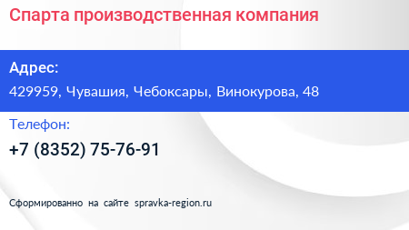 Спарта, производственная компания по адресу 429959, Чувашия, Чебоксары, Винокурова, 48 в дальнейшем Организация, размещена в следующих категориях: