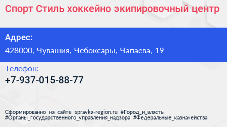 Спорт-Стиль, хоккейно-экипировочный центр по адресу 428000, Чувашия, Чебоксары, Чапаева, 19 в дальнейшем Организация, размещена в следующих категориях: