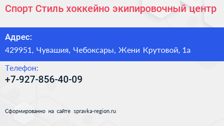 Спорт-Стиль, хоккейно-экипировочный центр по адресу 429951, Чувашия, Чебоксары, Жени Крутовой, 1а в дальнейшем Организация, размещена в следующих категориях: