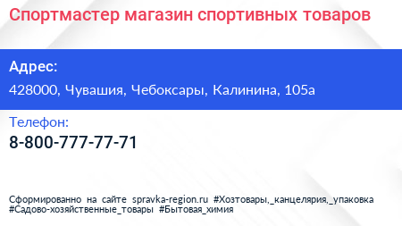 Спортмастер, магазин спортивных товаров по адресу 428000, Чувашия, Чебоксары, Калинина, 105а в дальнейшем Организация, размещена в следующих категориях: