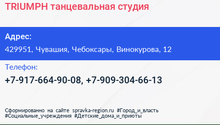 TRIUMPH, танцевальная студия по адресу 429951, Чувашия, Чебоксары, Винокурова, 12 в дальнейшем Организация, размещена в следующих категориях: