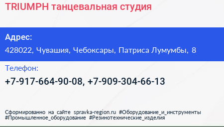 TRIUMPH, танцевальная студия по адресу 428022, Чувашия, Чебоксары, Патриса Лумумбы, 8 в дальнейшем Организация, размещена в следующих категориях: