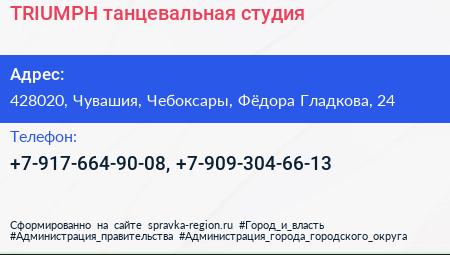 TRIUMPH, танцевальная студия по адресу 428020, Чувашия, Чебоксары, Фёдора Гладкова, 24 в дальнейшем Организация, размещена в следующих категориях: