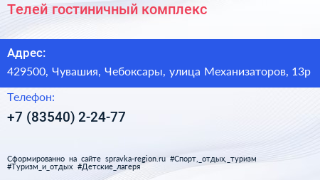 Телей, гостиничный комплекс по адресу 429500, Чувашия, Чебоксары, улица Механизаторов, 13р в дальнейшем Организация, размещена в следующих категориях: