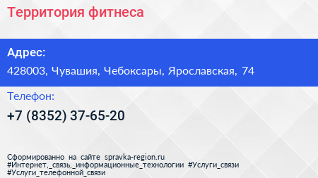 Территория фитнеса по адресу 428003, Чувашия, Чебоксары, Ярославская, 74 в дальнейшем Организация, размещена в следующих категориях: