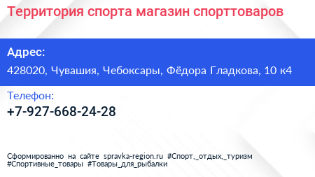 Территория спорта, магазин спорттоваров по адресу 428020, Чувашия, Чебоксары, Фёдора Гладкова, 10 к4 в дальнейшем Организация, размещена в следующих категориях: