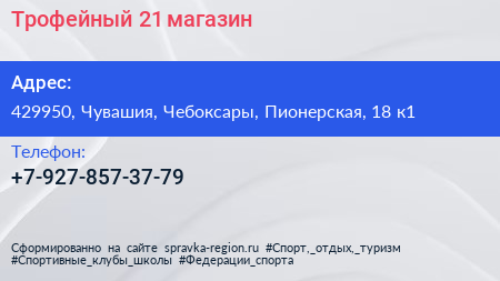 Трофейный 21, магазин по адресу 429950, Чувашия, Чебоксары, Пионерская, 18 к1 в дальнейшем Организация, размещена в следующих категориях: