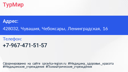 ТурМир по адресу 428032, Чувашия, Чебоксары, Ленинградская, 16 в дальнейшем Организация, размещена в следующих категориях: