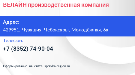 ВЕЛАЙН, производственная компания по адресу 429951, Чувашия, Чебоксары, Молодёжная, 6а в дальнейшем Организация, размещена в следующих категориях: