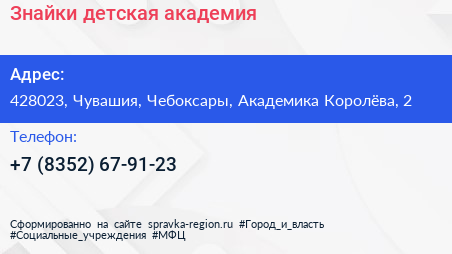 Знайки, детская академия по адресу 428023, Чувашия, Чебоксары, Академика Королёва, 2 в дальнейшем Организация, размещена в следующих категориях: