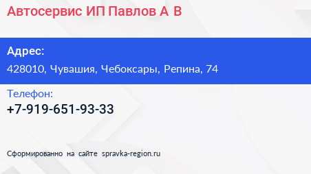 Автосервис, ИП Павлов А.В. по адресу 428010, Чувашия, Чебоксары, Репина, 74 в дальнейшем Организация, размещена в следующих категориях: