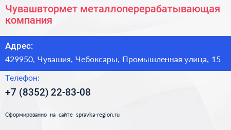 Чувашвтормет, металлоперерабатывающая компания по адресу 429950, Чувашия, Чебоксары, Промышленная улица, 15 в дальнейшем Организация, размещена в следующих категориях: