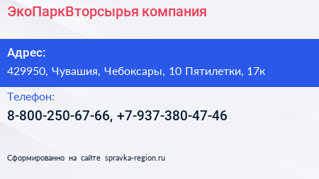 ЭкоПаркВторсырья, компания по адресу 429950, Чувашия, Чебоксары, 10 Пятилетки, 17к в дальнейшем Организация, размещена в следующих категориях: