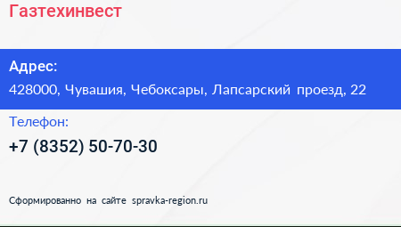 Газтехинвест по адресу 428000, Чувашия, Чебоксары, Лапсарский проезд, 22 в дальнейшем Организация, размещена в следующих категориях: