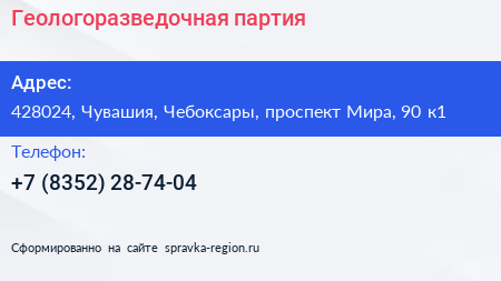 Геологоразведочная партия по адресу 428024, Чувашия, Чебоксары, проспект Мира, 90 к1 в дальнейшем Организация, размещена в следующих категориях: