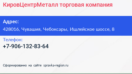 КировЦентрМеталл, торговая компания по адресу 428016, Чувашия, Чебоксары, Ишлейское шоссе, 8 в дальнейшем Организация, размещена в следующих категориях: