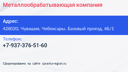 Металлообрабатывающая компания по адресу 428020, Чувашия, Чебоксары, Базовый проезд, 4Б/1 в дальнейшем Организация, размещена в следующих категориях: