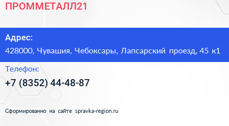ПРОММЕТАЛЛ21 по адресу 428000, Чувашия, Чебоксары, Лапсарский проезд, 45 к1 в дальнейшем Организация, размещена в следующих категориях: