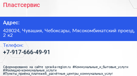 Пластсервис по адресу 428024, Чувашия, Чебоксары, Мясокомбинатский проезд, 2 к2 в дальнейшем Организация, размещена в следующих категориях: