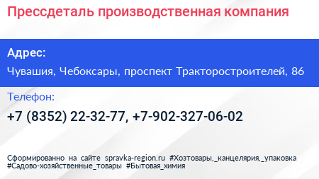 Прессдеталь, производственная компания по адресу Чувашия, Чебоксары, проспект Тракторостроителей, 86 в дальнейшем Организация, размещена в следующих категориях: