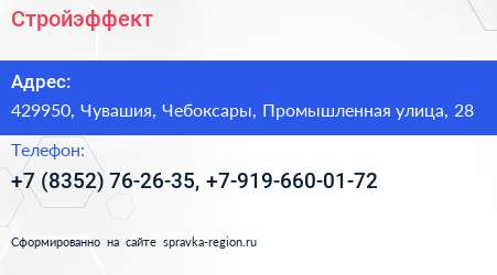 Стройэффект по адресу 429950, Чувашия, Чебоксары, Промышленная улица, 28 в дальнейшем Организация, размещена в следующих категориях: