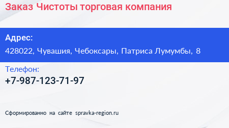 Заказ Чистоты, торговая компания по адресу 428022, Чувашия, Чебоксары, Патриса Лумумбы, 8 в дальнейшем Организация, размещена в следующих категориях: