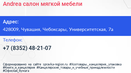 Andrea, салон мягкой мебели по адресу 428009, Чувашия, Чебоксары, Университетская, 7а в дальнейшем Организация, размещена в следующих категориях: