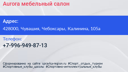 Aurora, мебельный салон по адресу 428000, Чувашия, Чебоксары, Калинина, 105а в дальнейшем Организация, размещена в следующих категориях: