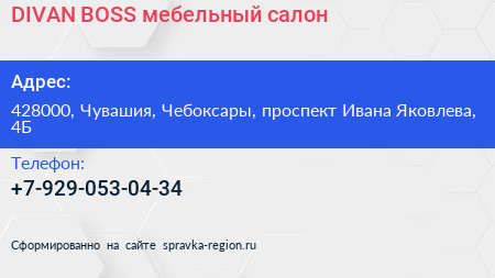 DIVAN BOSS, мебельный салон по адресу 428000, Чувашия, Чебоксары, проспект Ивана Яковлева, 4Б в дальнейшем Организация, размещена в следующих категориях: