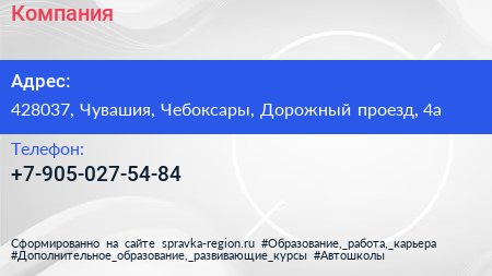 Компания по адресу 428037, Чувашия, Чебоксары, Дорожный проезд, 4а в дальнейшем Организация, размещена в следующих категориях:
