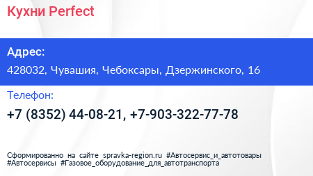 Кухни Perfect по адресу 428032, Чувашия, Чебоксары, Дзержинского, 16 в дальнейшем Организация, размещена в следующих категориях: