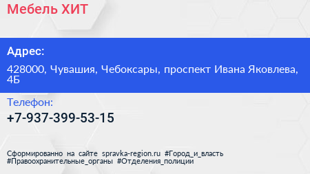 Мебель ХИТ по адресу 428000, Чувашия, Чебоксары, проспект Ивана Яковлева, 4Б в дальнейшем Организация, размещена в следующих категориях: