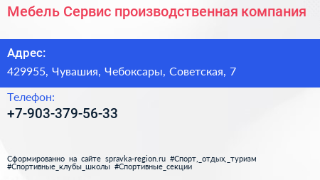 Мебель-Сервис, производственная компания по адресу 429955, Чувашия, Чебоксары, Советская, 7 в дальнейшем Организация, размещена в следующих категориях: