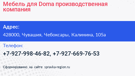 Мебель для Doma, производственная компания по адресу 428000, Чувашия, Чебоксары, Калинина, 105а в дальнейшем Организация, размещена в следующих категориях: