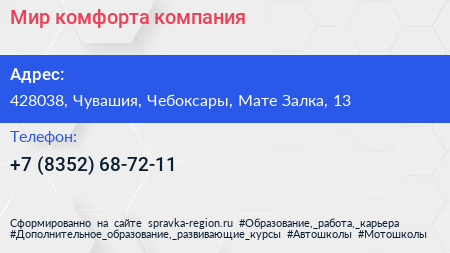 Мир комфорта, компания по адресу 428038, Чувашия, Чебоксары, Мате Залка, 13 в дальнейшем Организация, размещена в следующих категориях: