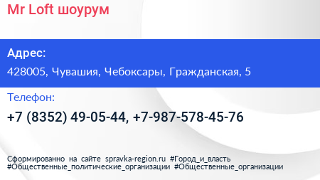 Mr.Loft, шоурум по адресу 428005, Чувашия, Чебоксары, Гражданская, 5 в дальнейшем Организация, размещена в следующих категориях: