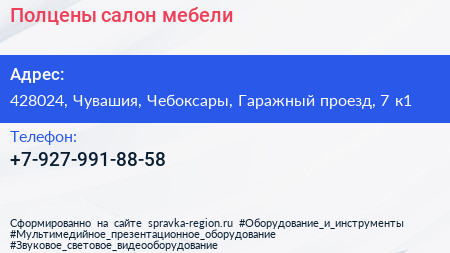 Полцены, салон мебели по адресу 428024, Чувашия, Чебоксары, Гаражный проезд, 7 к1 в дальнейшем Организация, размещена в следующих категориях: