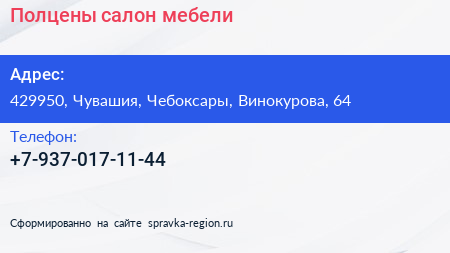 Полцены, салон мебели по адресу 429950, Чувашия, Чебоксары, Винокурова, 64 в дальнейшем Организация, размещена в следующих категориях: