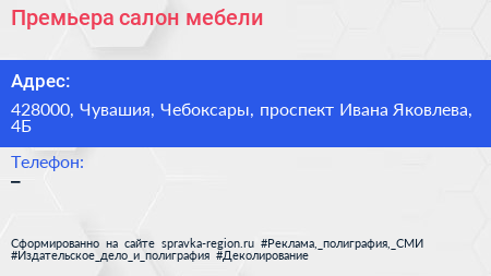 Премьера, салон мебели по адресу 428000, Чувашия, Чебоксары, проспект Ивана Яковлева, 4Б в дальнейшем Организация, размещена в следующих категориях: