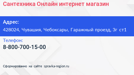 Сантехника-Онлайн, интернет-магазин по адресу 428024, Чувашия, Чебоксары, Гаражный проезд, 3г ст1 в дальнейшем Организация, размещена в следующих категориях: