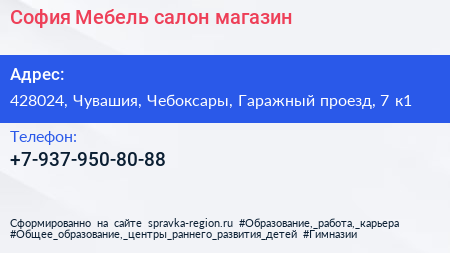 София Мебель, салон-магазин по адресу 428024, Чувашия, Чебоксары, Гаражный проезд, 7 к1 в дальнейшем Организация, размещена в следующих категориях: