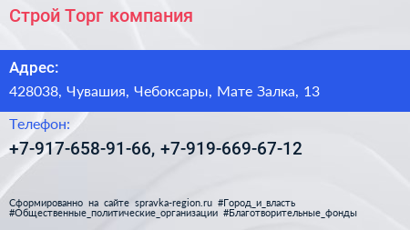 Строй Торг, компания по адресу 428038, Чувашия, Чебоксары, Мате Залка, 13 в дальнейшем Организация, размещена в следующих категориях: