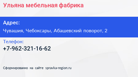 Ульяна, мебельная фабрика по адресу Чувашия, Чебоксары, Абашевский поворот, 2 в дальнейшем Организация, размещена в следующих категориях: