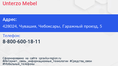 Unterzo Mebel по адресу 428024, Чувашия, Чебоксары, Гаражный проезд, 5 в дальнейшем Организация, размещена в следующих категориях: