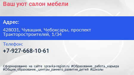 Ваш уют, салон мебели по адресу 428031, Чувашия, Чебоксары, проспект Тракторостроителей, 1/34 в дальнейшем Организация, размещена в следующих категориях: