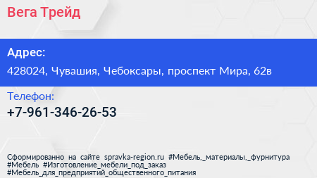 Вега-Трейд по адресу 428024, Чувашия, Чебоксары, проспект Мира, 62в в дальнейшем Организация, размещена в следующих категориях: